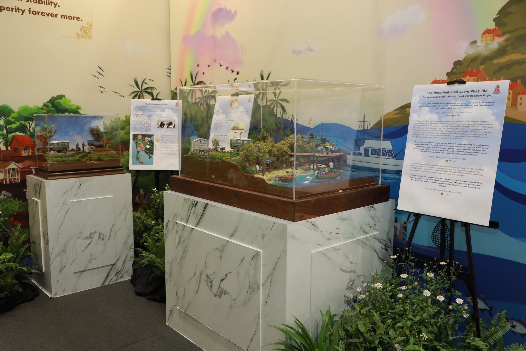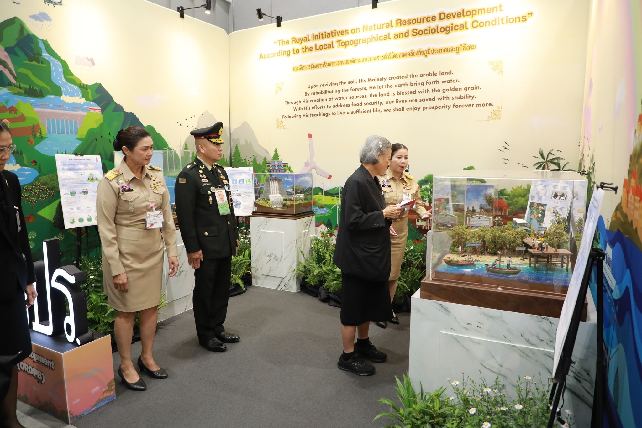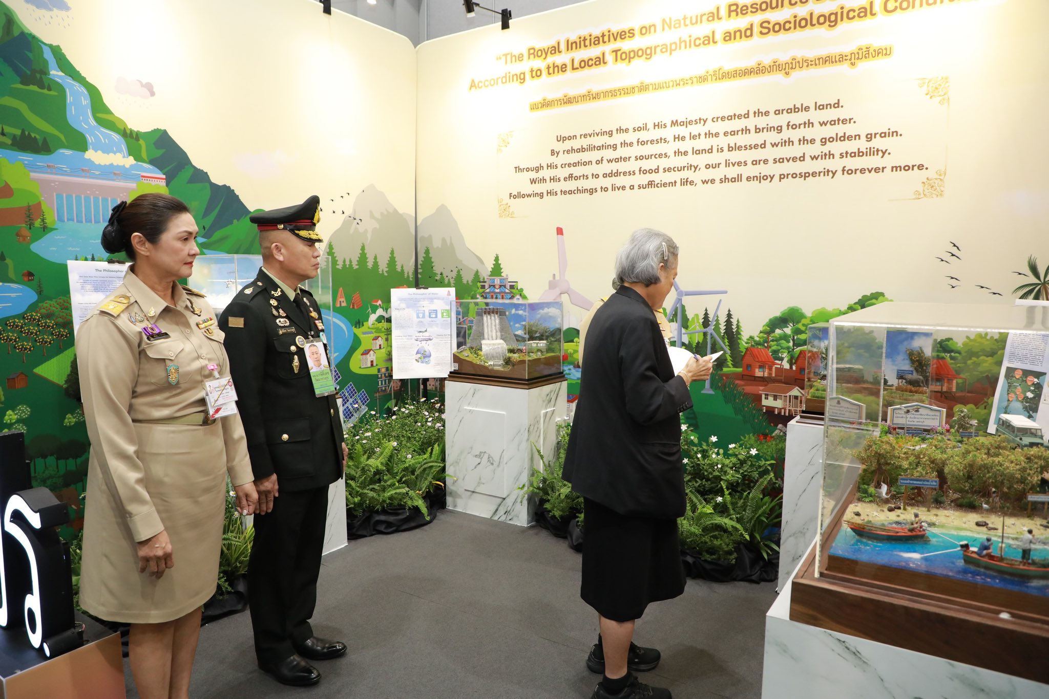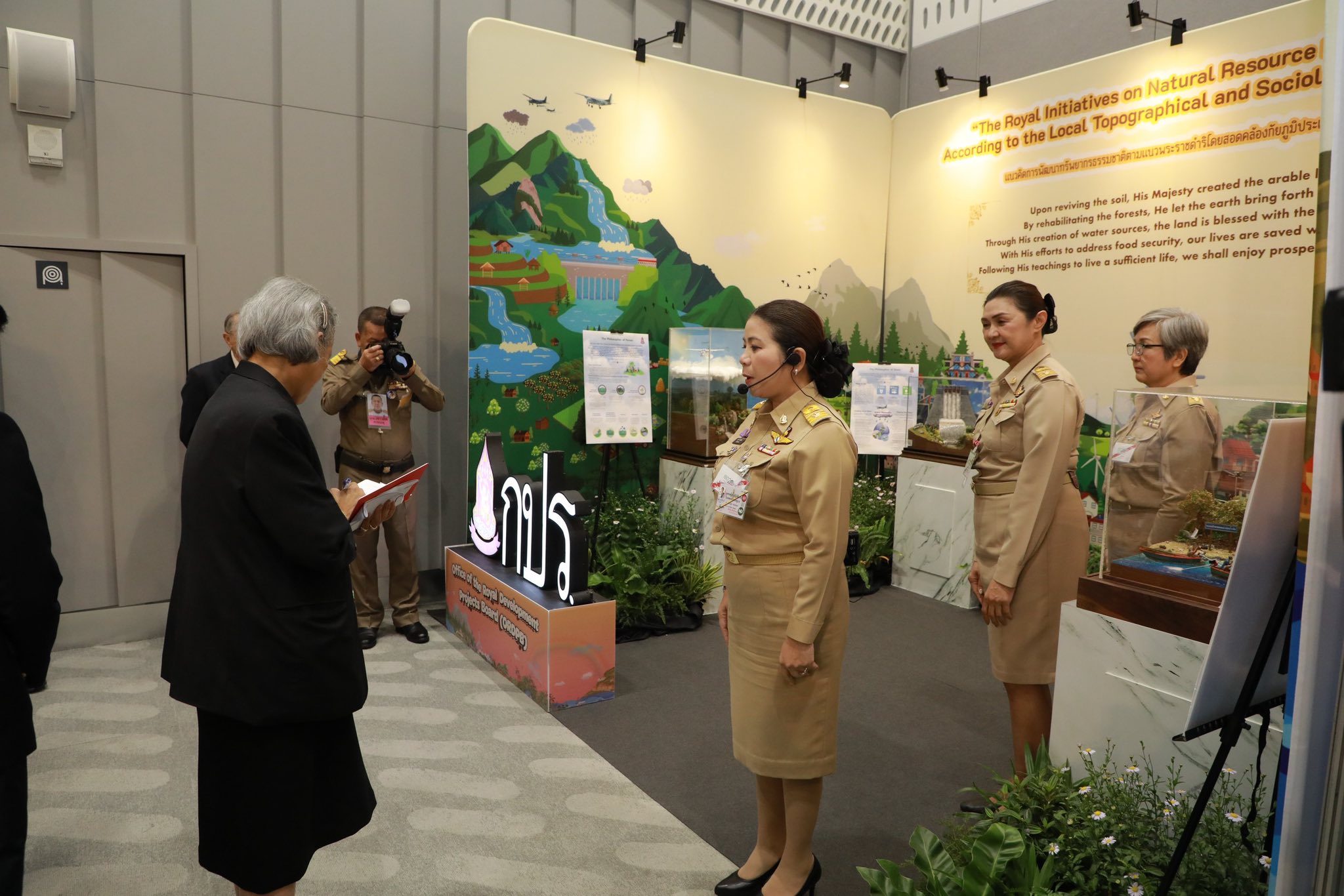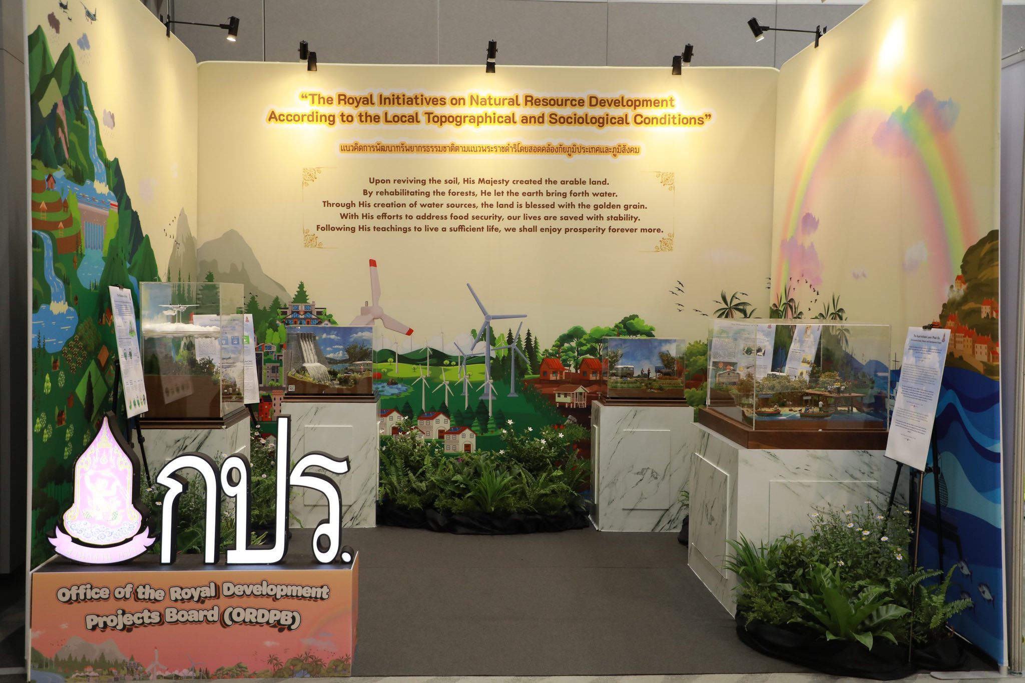 ซึ่งสำนักงาน กปร. ได้ร่วมจัดนิทรรศการภายใต้หัวข้อนิทรรศการ “การอนุรักษ์ทรัพยากรธรรมชาติตามแนวพระราชดำริโดยสอดคล้องกับภูมิประเทศและภูมิสังคม” โดยมีเนื้อหาที่สะท้อนพระอัจฉริยภาพของพระบาทสมเด็จพระบรมชนกาธิเบศร มหาภูมิพลอดุลยเดชมหาราช บรมนาถบพิตร ที่ทรงได้รับการยกย่องจากนานาประเทศให้เป็นปราชญ์แห่งดิน ปราชญ์แห่งน้ำ ปราชญ์แห่งป่า และปราชญ์แห่งพลังงานทดแทน เช่น พลังงานน้ำ ไบโอดีเซล ซึ่งนำไปสู่การหมุนเวียนการใช้ประโยชน์ทรัพยากรธรรมชาติให้คุ้มค่าที่สูงสุด ควบคู่ไปกับการอนุรักษ์และฟื้นฟู ดังตัวอย่างการดำเนินการที่โครงการศึกษาวิจัยและพัฒนาสิ่งแวดล้อมแหลมผักเบี้ยอันเนื่องมาจากพระราชดำริ ทำให้ประเทศไทยมีความอุดมสมบูรณ์ทั้งดินน้ำป่า พืชพรรณธรรมชาติและสิ่งมีชีวิตอย่างยั่งยืนสืบไป และสอดคล้องกับเป้าหมายการพัฒนาอย่างยั่งยืนขององค์การสหประชาชาติ