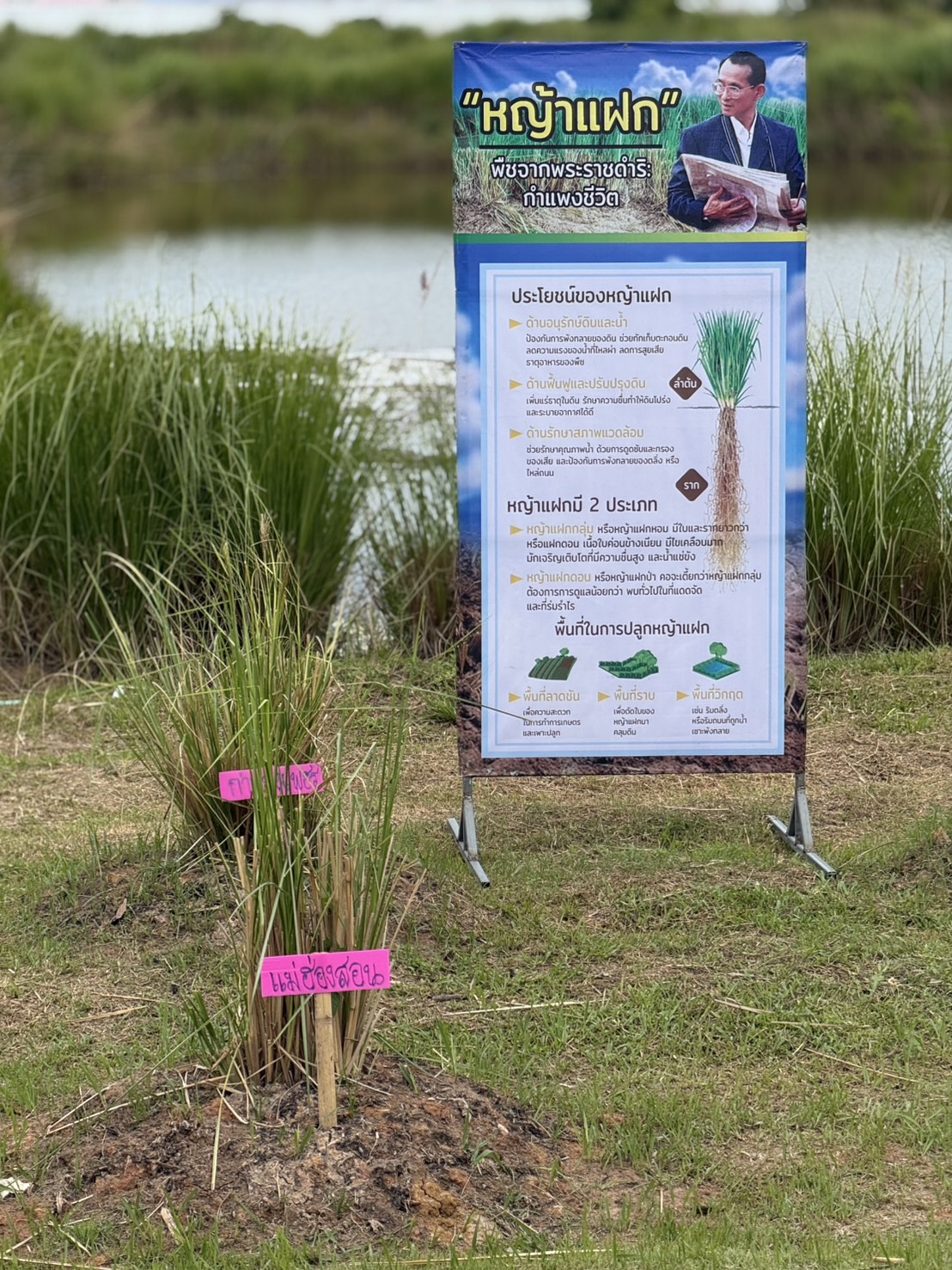 ทั้งนี้ เพื่อแก้ไขปัญหาดังกล่าว จึงได้ปลูกหญ้าแฝกสายพันธุ์สงขลา 3 รอบขอบสระและคันร่องสวน โดยหญ้าแฝกมีระบบรากลึกและหนาแน่น ช่วยยึดหน้าดิน รักษาความชุ่มชื้น ป้องกันการชะล้างพังทลาย และฟื้นฟูคุณภาพดิน ทำให้พื้นที่สามารถใช้ประโยชน์ทางการเกษตรได้อย่างยั่งยืน พร้อมทั้งเป็นตัวอย่างการประยุกต์ใช้หญ้าแฝกที่สอดคล้องกับสภาพปัญหาจริงของพื้นที่